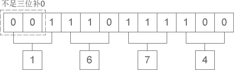 二进制整数转换为八进制整数时,每三位二进制数字转换为一位八进制数字,运算的顺序是从低位向高位依次进行,高位不足三位用零补齐。下图演示了如何将二进制整数 1110111100 转换为八进制:(4 2 1)