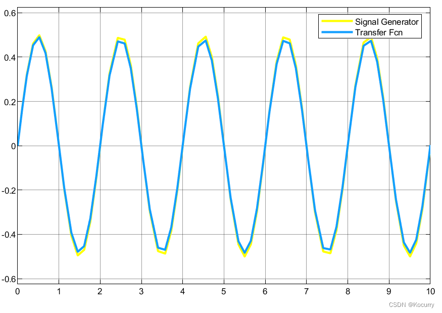 由上图可以看出,黄色曲线是信号发生器产生的信号,蓝色曲线是经过传递函数的信号。两种信号较为贴合,可以判断设计的重复控制器的控制效果较好。