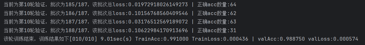 print('该轮训练结束,训练结果如下[%03d/%03d] %2.2fsec(s) TrainAcc:%3.6f TrainLoss:%3.6f | valAcc:%3.6f valLoss:%3.6f \n\n'
