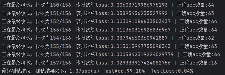 print("正在最终测试:批次为{}/{},该批次总loss:{} | 正确acc数量:{}"