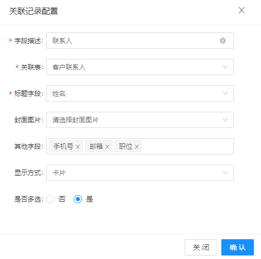 “客户联系人”中的“姓名”字段 - 封面图片:可选择关联表中的图片作为关联记录的封面图片展示,可为空
