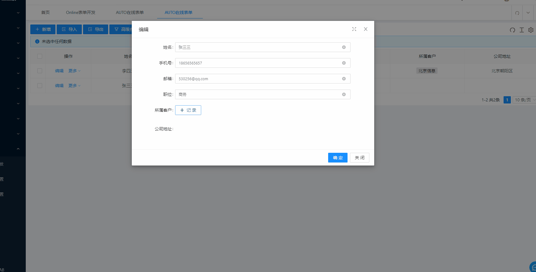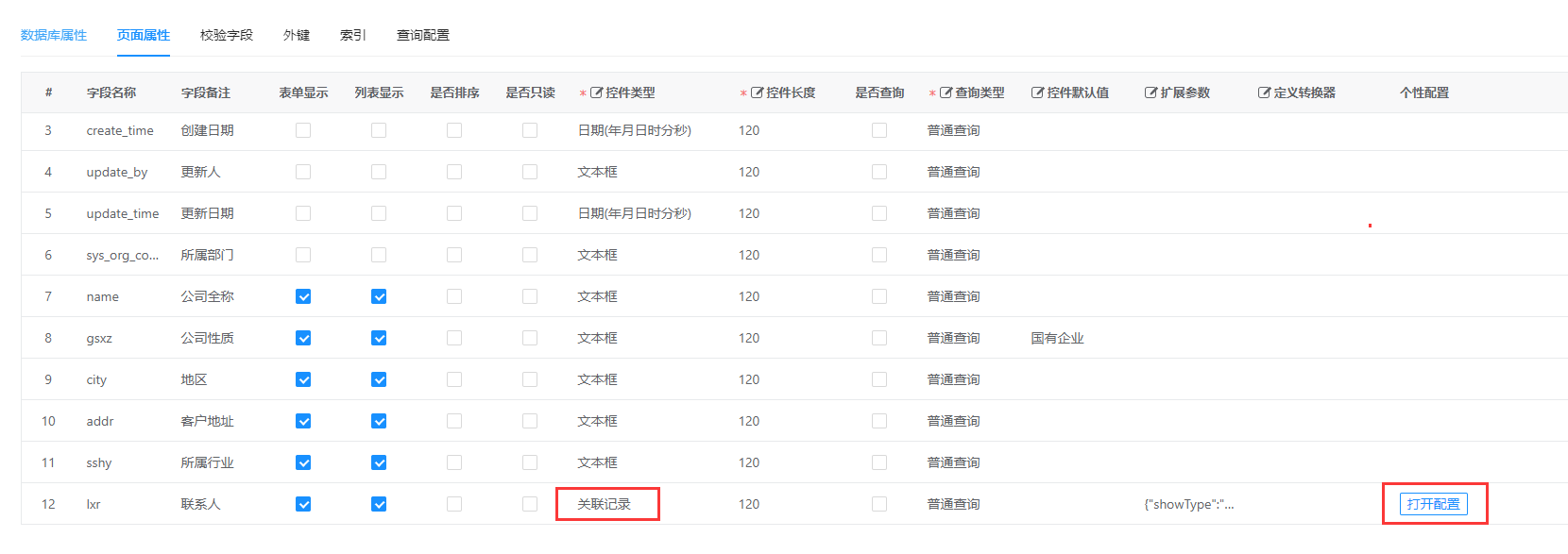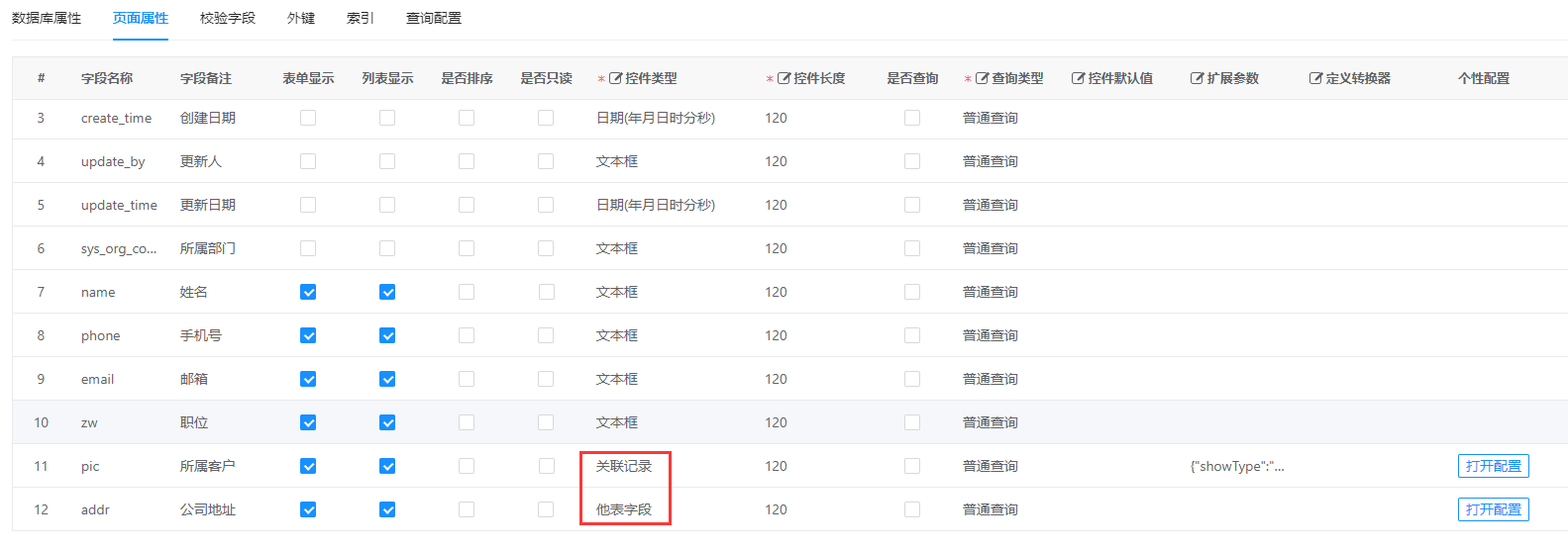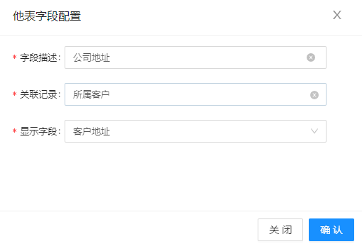 新增字段“所属客户”、“公司地址”后,在“页面属性”-“控件类型”中分别选择为“关联记录”、“他表字段”