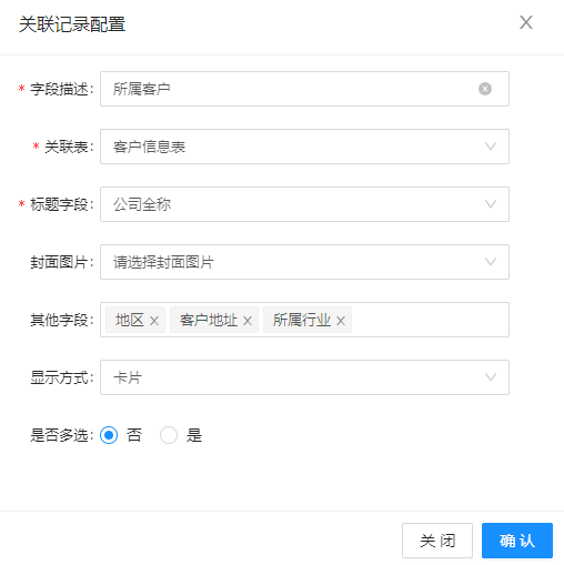 “客户信息”表中的“公司全称” - 封面图片:选择关联表中图片作为关联记录的封面图片展示,可为空