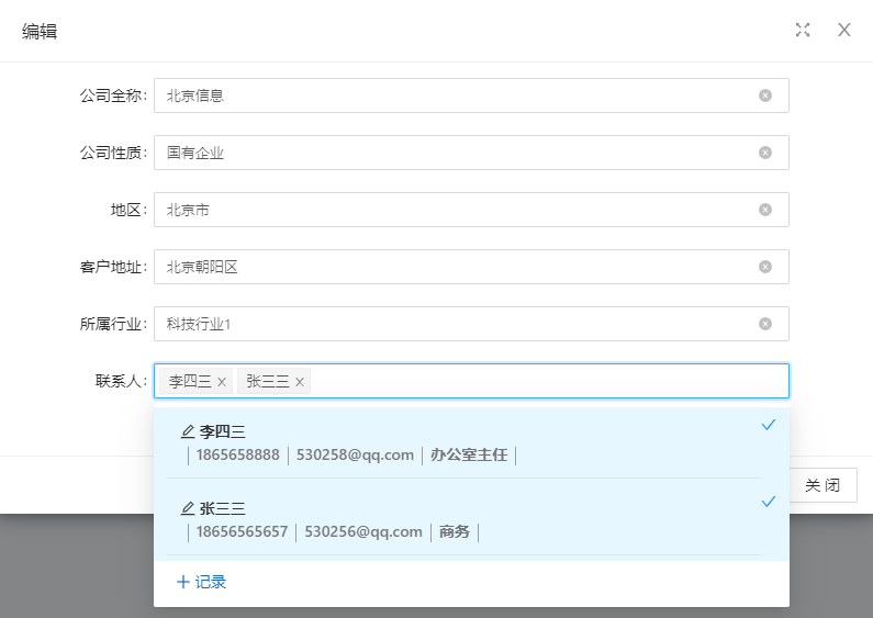 如果设置了关联关系,当创建联系人记录时,只需关联到《客户信息》中的已有客户记录即可,无需另外录入,再查看时,也能快速查看客户公司的详细信息。