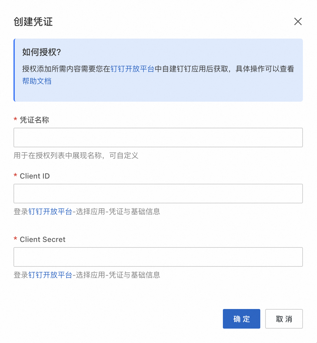 - 点击添加钉钉鉴权凭证,填写上面获取的钉钉应用Client ID和Client Secret