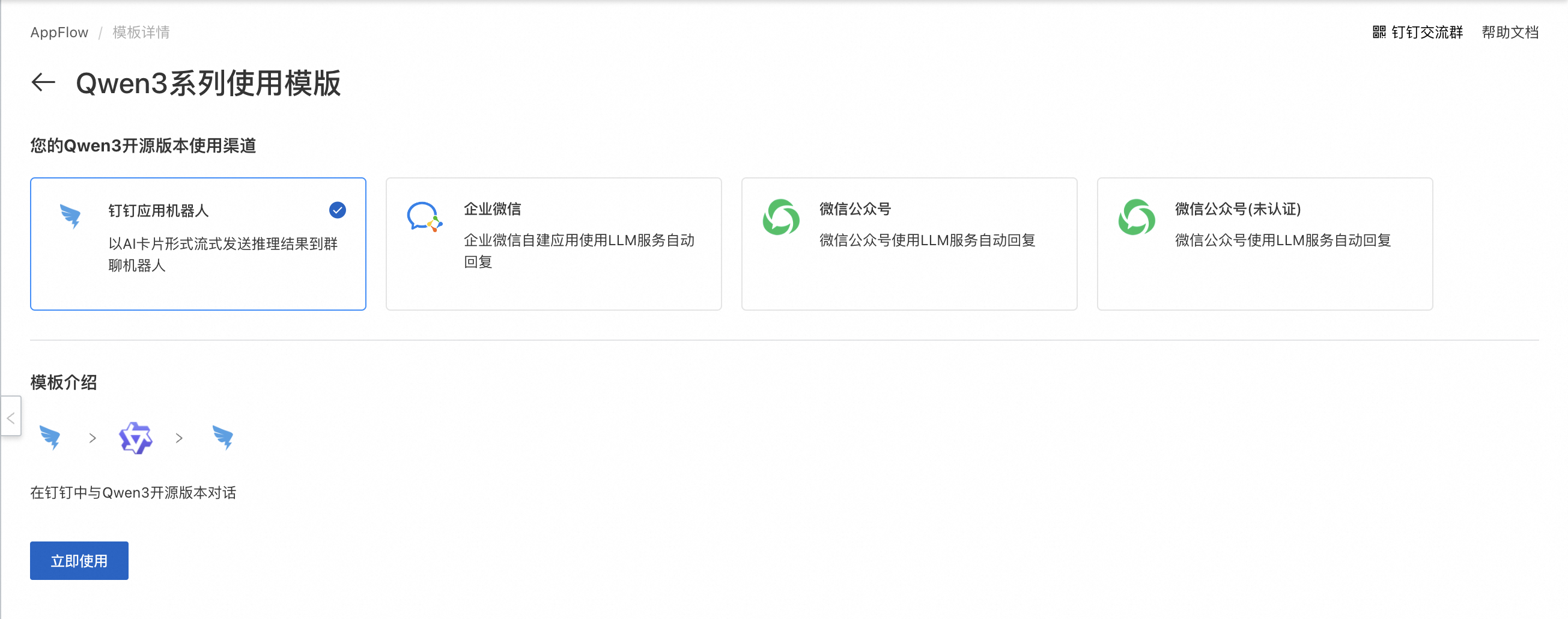 - 访问AppFlow模版中心,选择钉钉应用机器人,点击立即使用