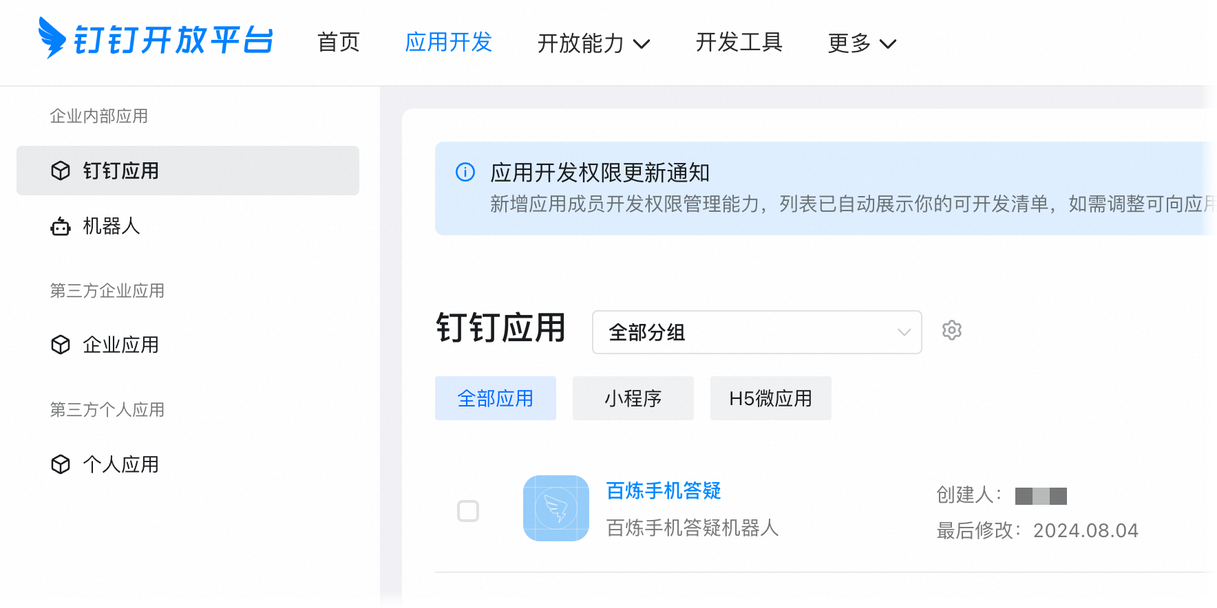 - 访问钉钉应用列表。找到刚刚创建的应用,点击应用名称进入详情页面。