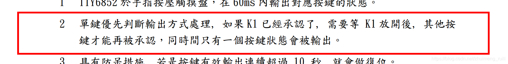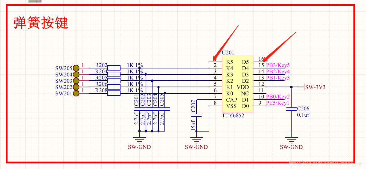 问题: 该芯片有6路的按键输入输出,当时只做了5路,有一路引脚空闲,发现有时所有按键会失灵。重新查看了一下芯片文档,发现该芯片只能同时检测一个按键,一个按键按下之后,其他按键就不生效了