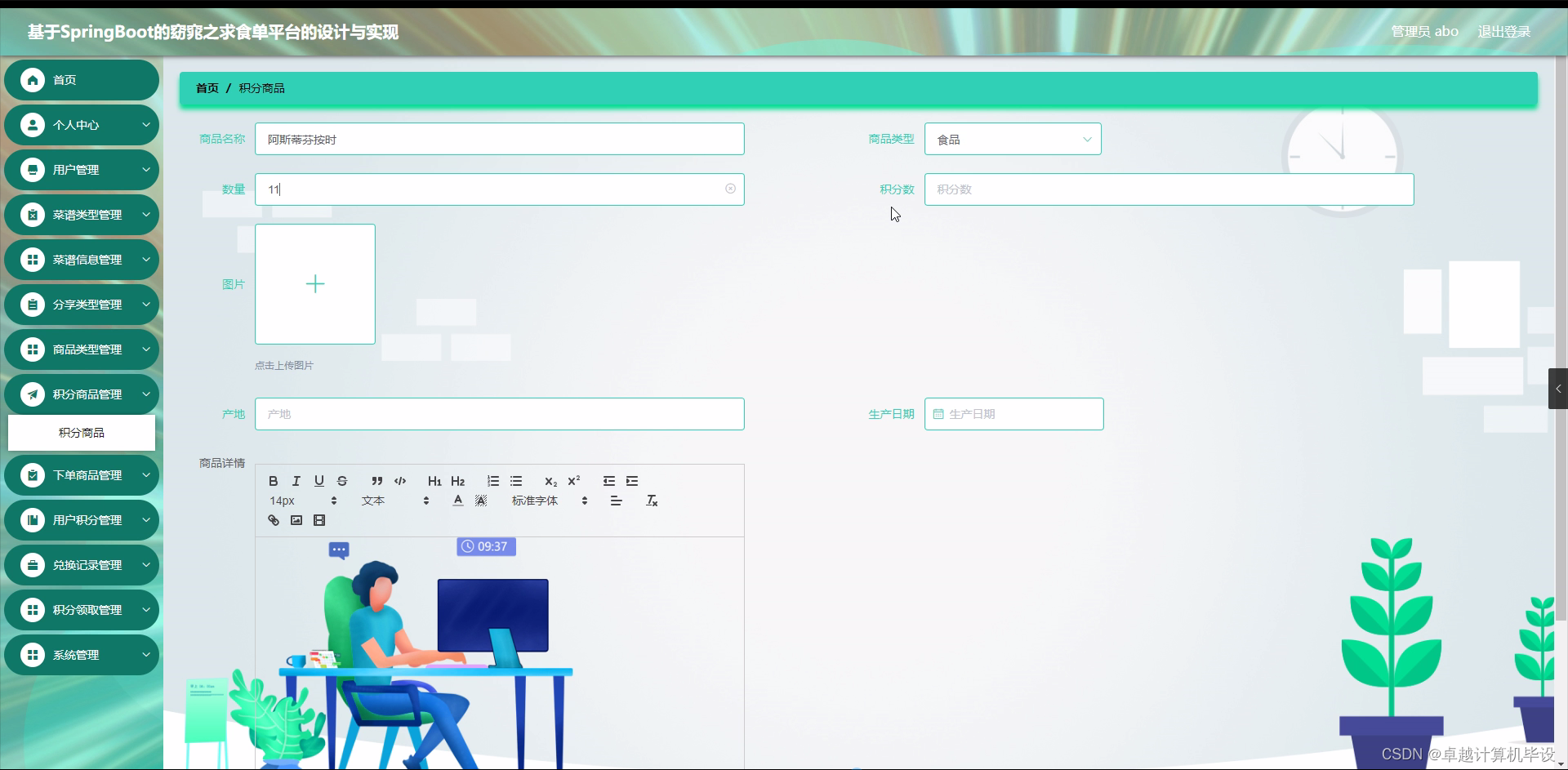 - 积分商品管理:包括积分商品发布、兑换规则设置等。