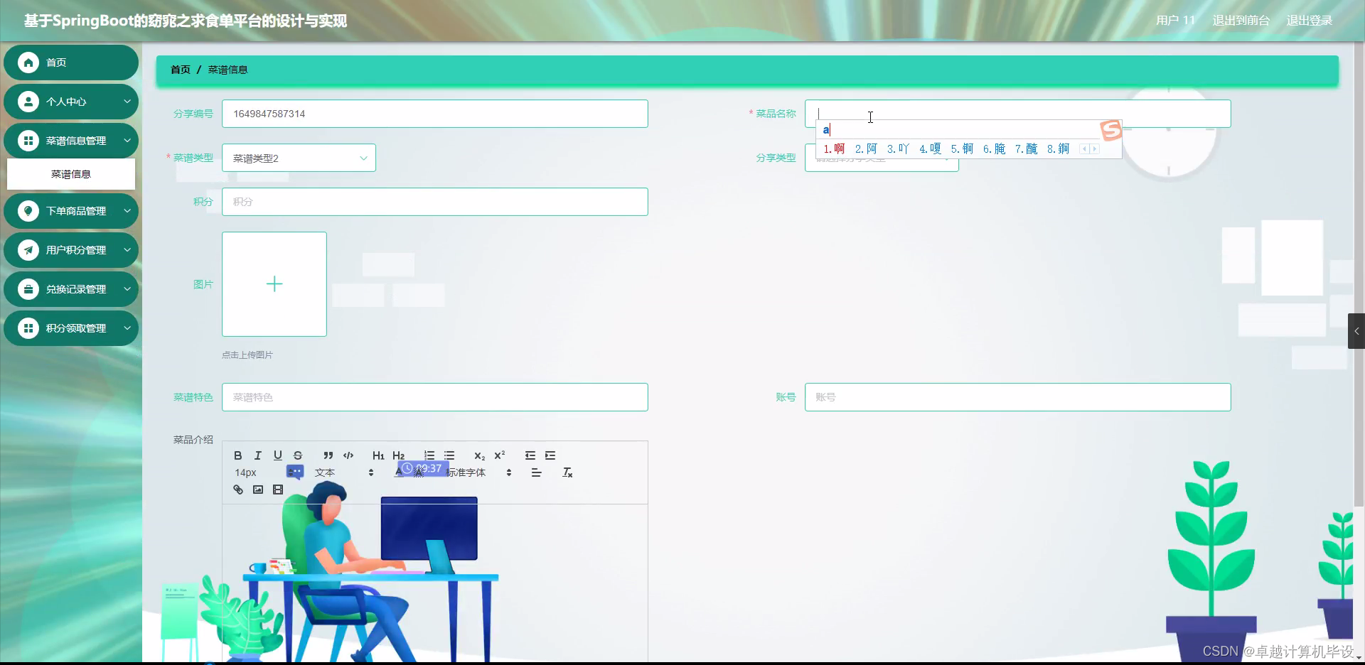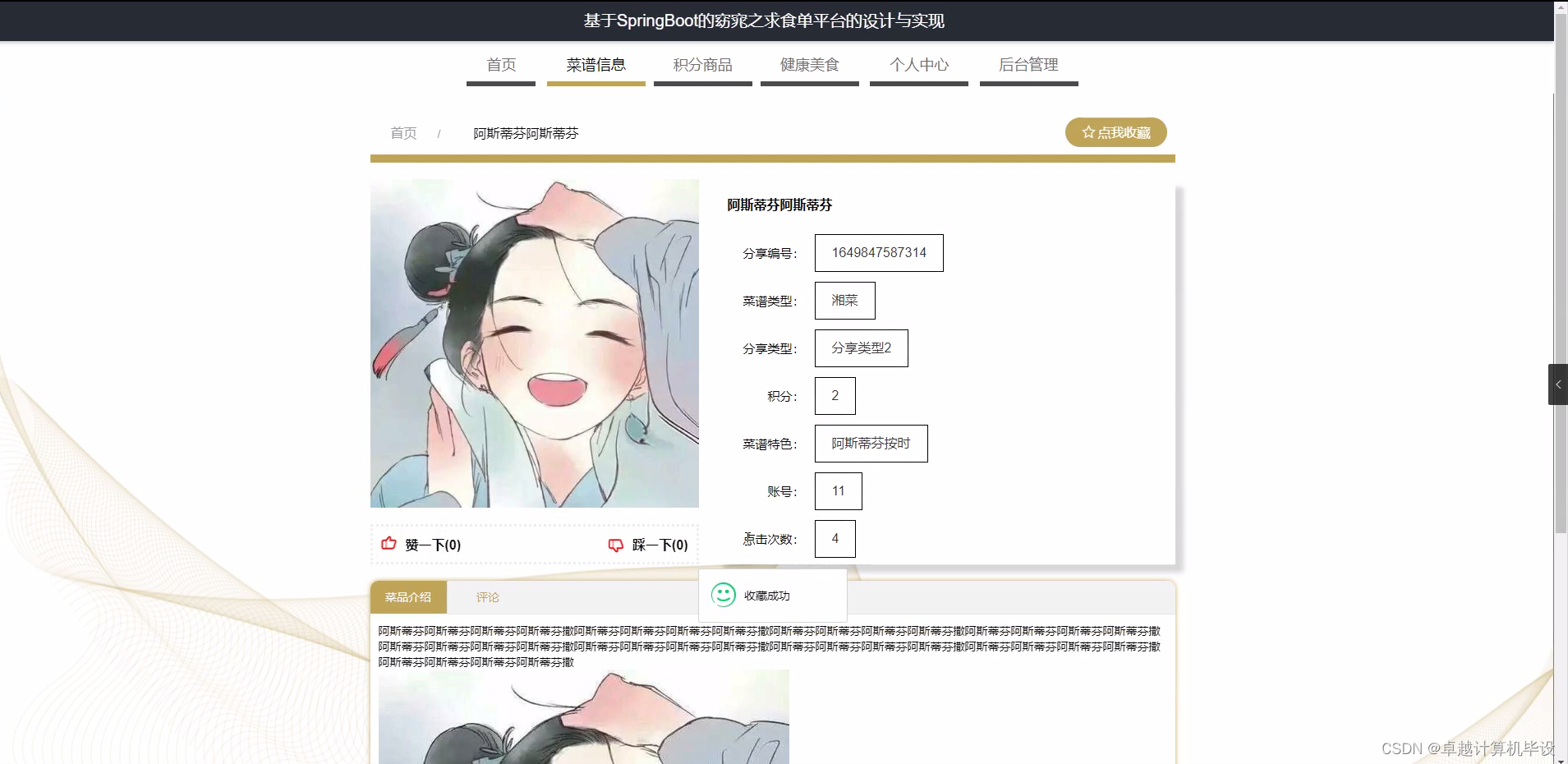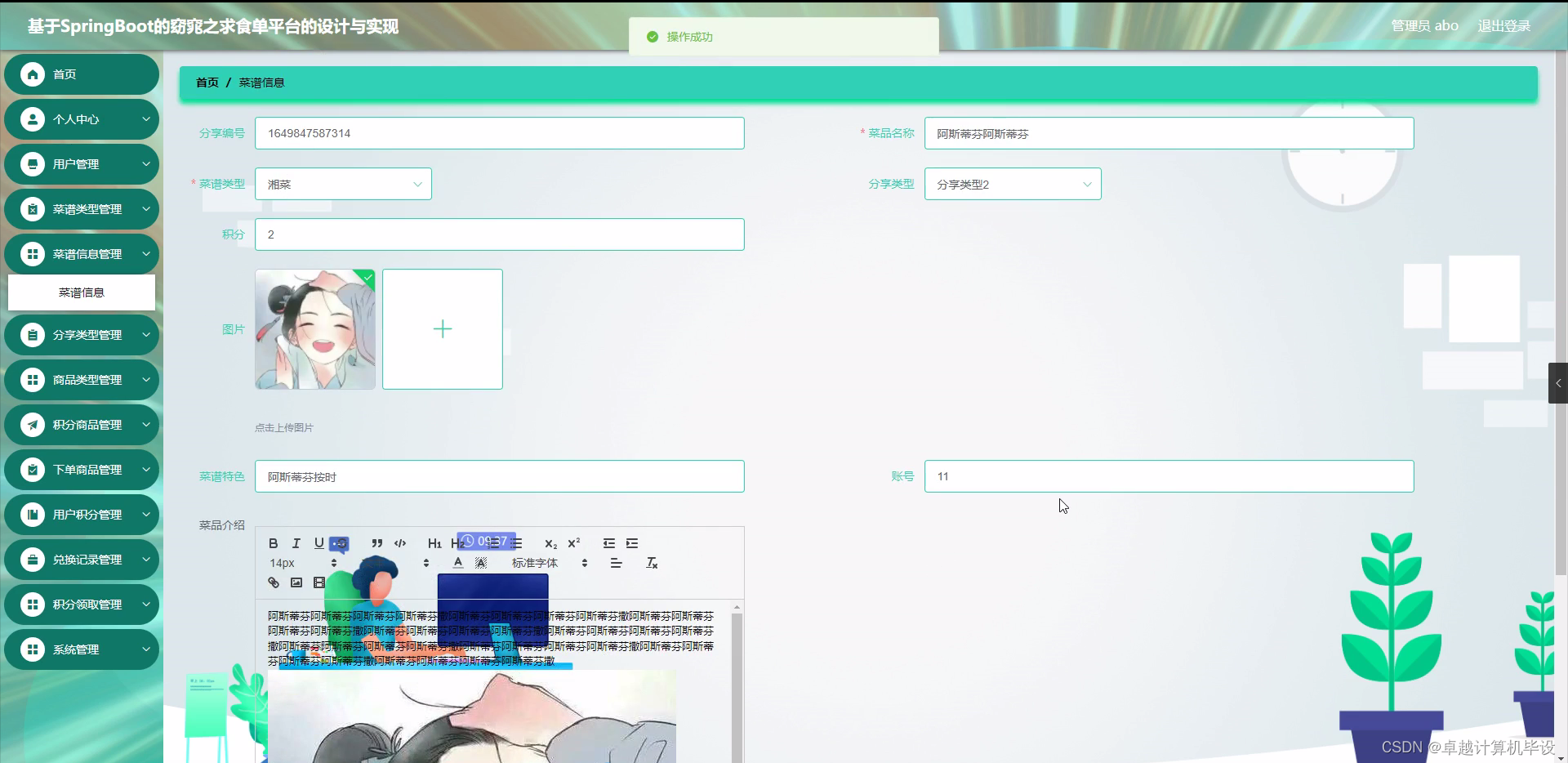 - 菜谱信息管理:包括菜谱发布、编辑、删除等。