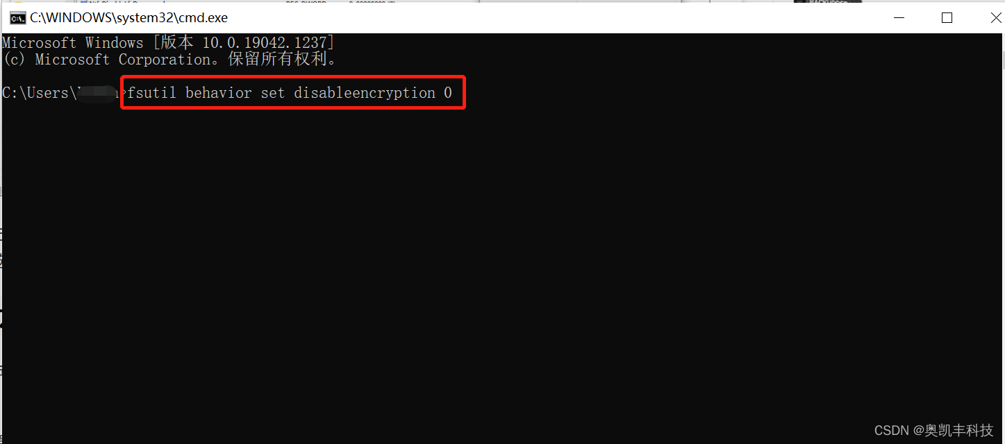 如果觉得操纵起来太麻烦,也可以在运行中输入cmd,打开命令窗口,输入fsutil behavior set disableencryption 0,通过命令进行设置。