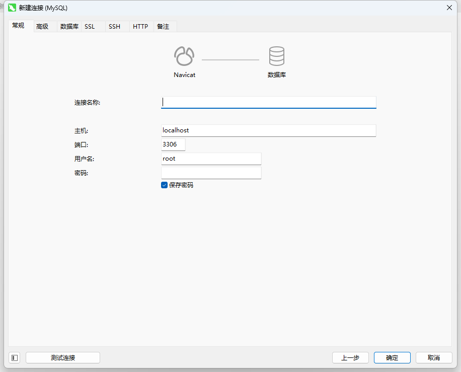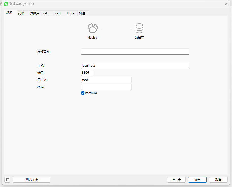常规页面还是按照原来的要求填写,不过里面填写的数据都是服务器上的真实数据,主机localhost,端口3306,用户名和密码也按要求填写,然后点击上面的tab到SSH页面。