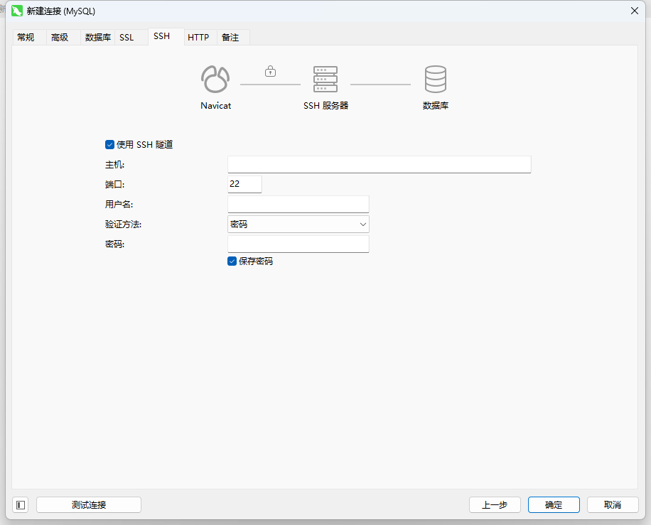 勾选使用SSH隧道,主机就是服务器的公网IP,端口一般默认是22,验证方法我使用的是密码,