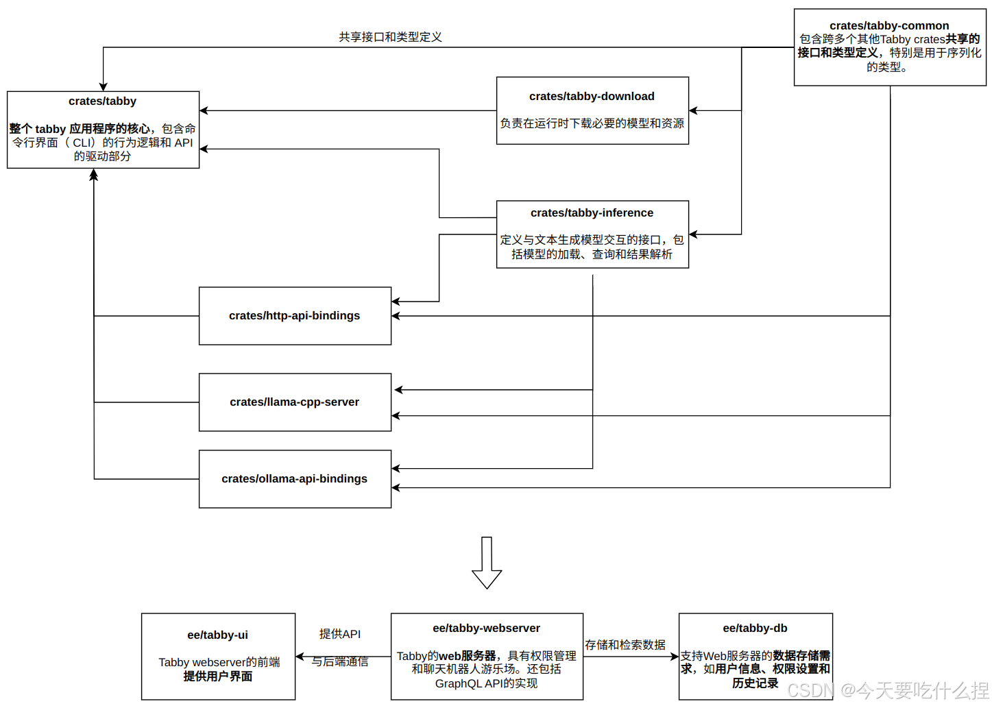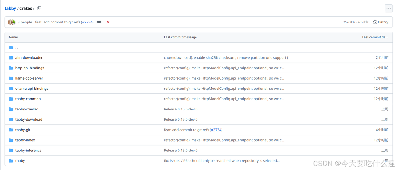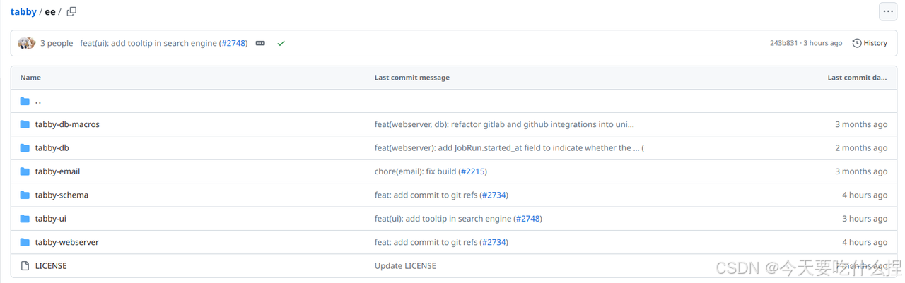 Tabby项目很大分为多个包,每个包负责不同的功能部分。位于tabby/crates目录下的为完全开源功能设置,位于tabby/ee下的为企业功能。(目前更新为如下)