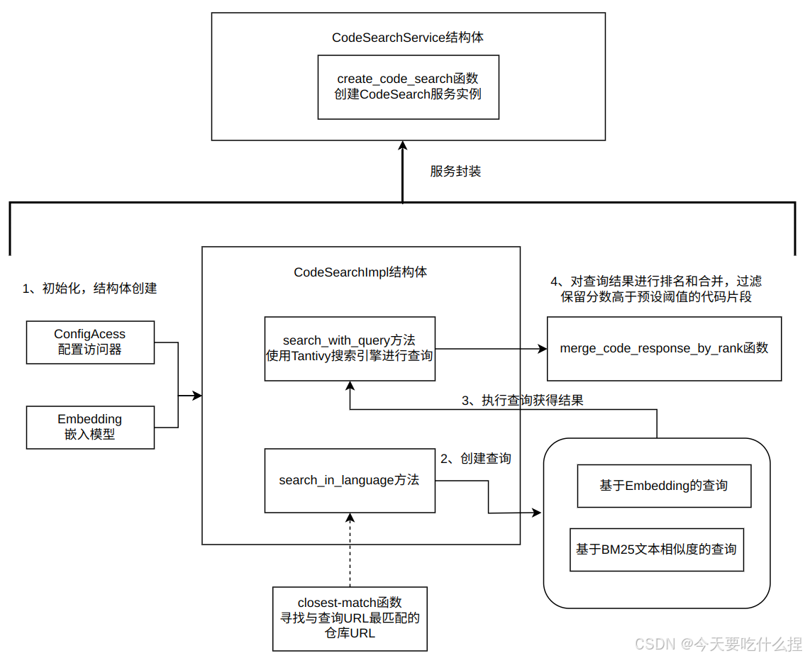 CodeSearchImpl 结构体: 包含了实际的搜索逻辑,包括使用Tantivy全文搜索引擎、embedding模型、以及缓存机制。