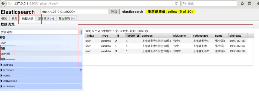 1.确保启动 es 服务 2.打开浏览器访问http://127.0.0.1:9200/_plugin/head 查看我们上节课创建的 userInfo。
