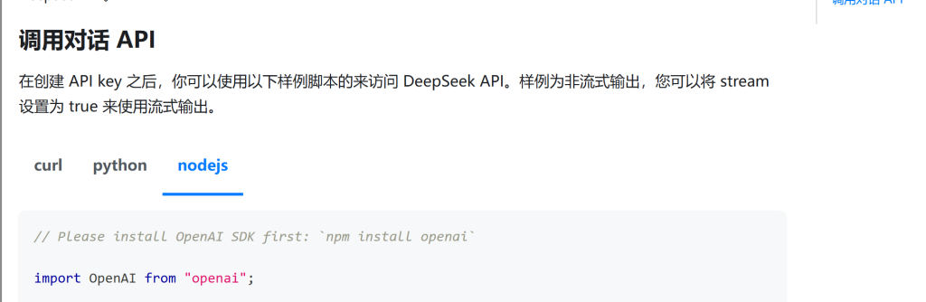 我使用的是基于node.js的Express.js框架,这里就以Express.js为例子,当然python,java都可以了,可以参考官方文档首次调用 API | DeepSeek API Docs。