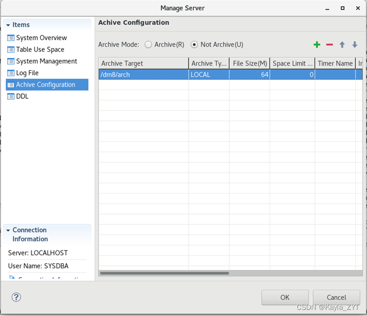 DDL:alter database add archivelog 'DEST=/dm8/arch, TYPE=LOCAL, FILE_SIZE=64, SPACE_LIMIT=0';