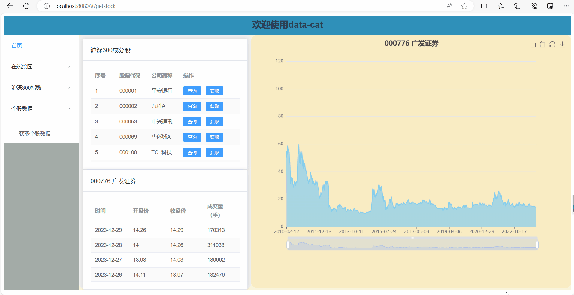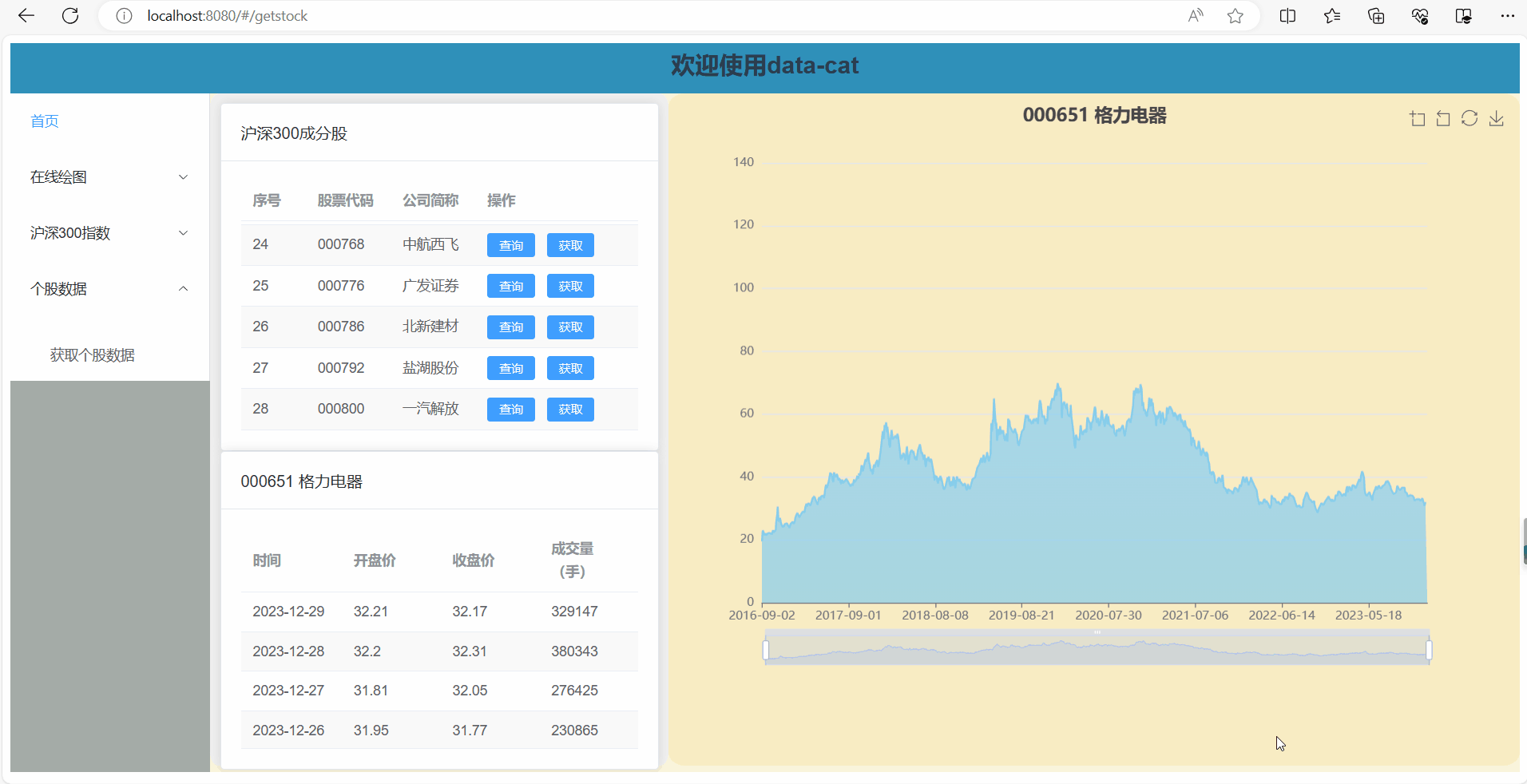 前面一篇文章介绍了获取个股数据的方法,本文将会对获取的接口进行一些优化,并且添加查询数据的接口,并且基于后端返回数据编写一个前端页面对数据进行展示。