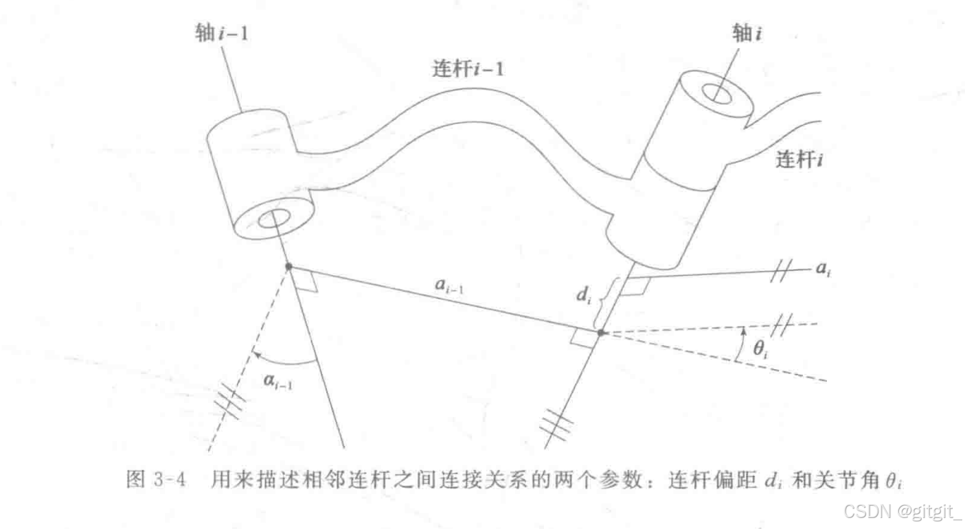 - 连杆扭转角αi :沿着连杆 i−1的 X轴,Zi轴到Zi轴的扭转角。