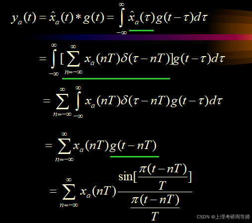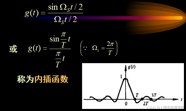 采样内插公式说明:只要满足采样频率高于两倍信号最高截止频率,则整个连续时间信号就可以用它的采样值来完全代表,而不会丢失任何信息。