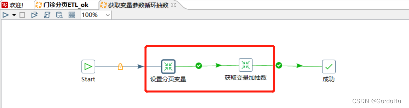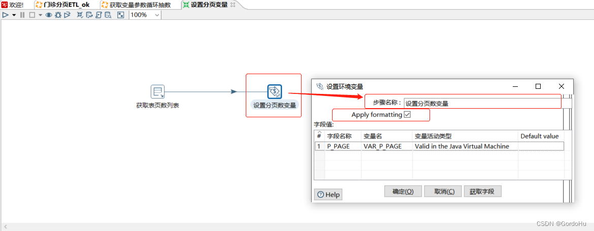 详细说一下 第三步中,第一个转换 (设置分页变量.ktr) 如下图示,有两个流程节点:
