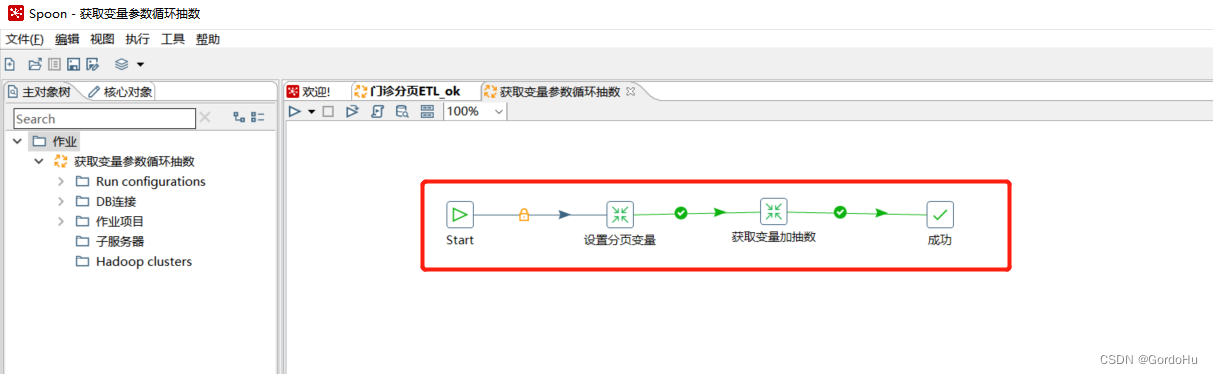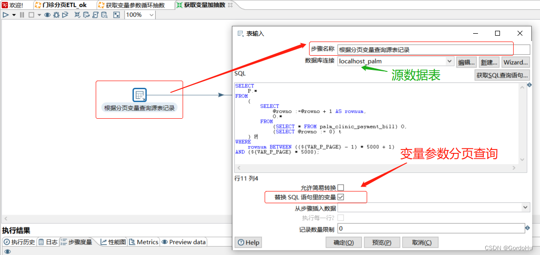 第三步: 创建(获取变量参数循环抽数)作业: 主要把上个转换的分页参数传入,用来分页查询,然后输出到目标表中.