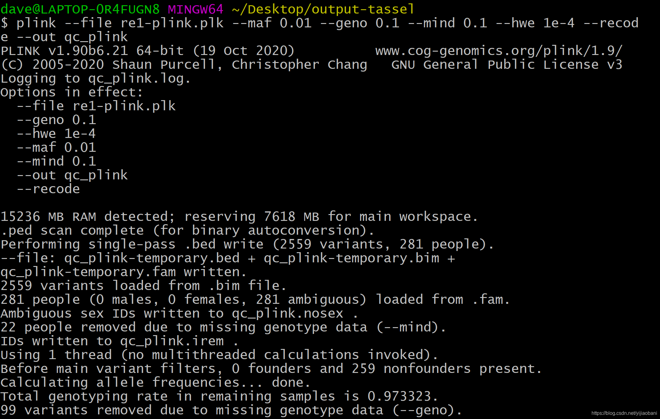 这里,我们直接用导出的re1的plink文件,进行质控,质控后再返回TASSEL中。
