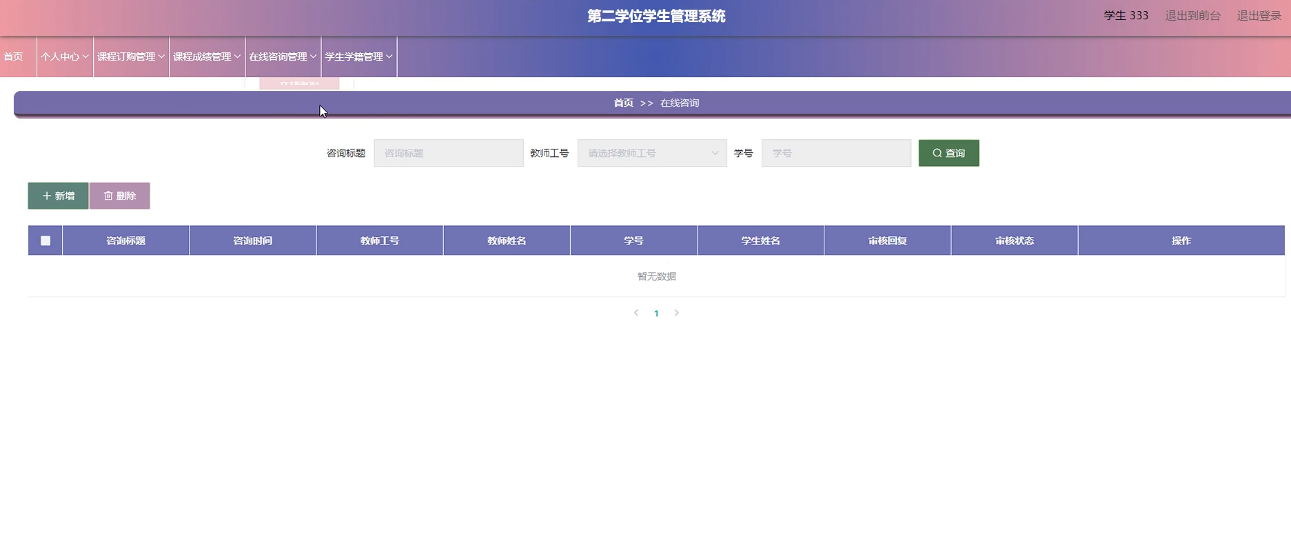 项目功能:学生,教师,班级信息,课程类别,课程信息,课程选择,在线咨询,成绩分类,课程成绩,学生学籍,课程退出,院系,专业,年级。