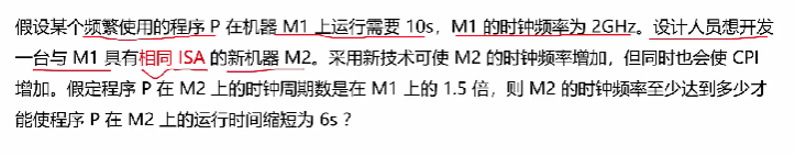 1.由于时钟频率提高,时钟周期缩小,这个改变会导致CPU的结构发生改变。同样,会使得其他性能指标降低。eg:上面M2的CPI变大,性能减低。