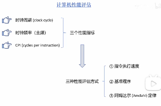 计算机三个性能指标:时钟周期(clock cycle)、时钟频率(主频)、CPI(cycles per instruction)在三种性能指标的基础上,学习三种性能评估的方法:指令执行速度、基准程序、阿姆达尔定律。