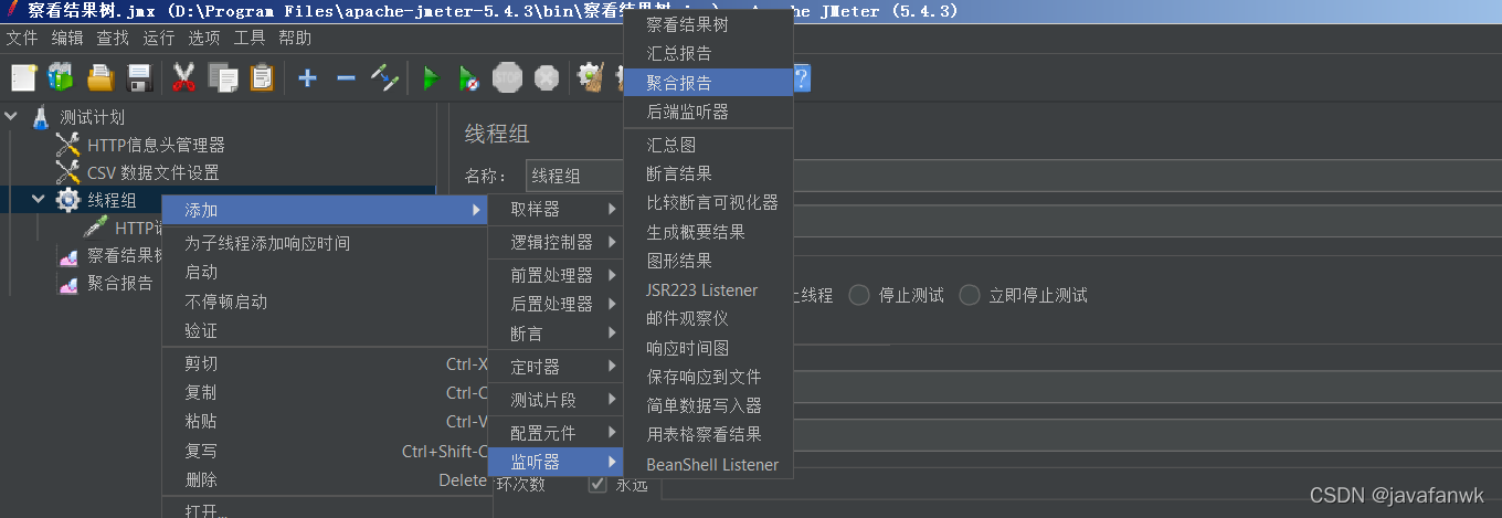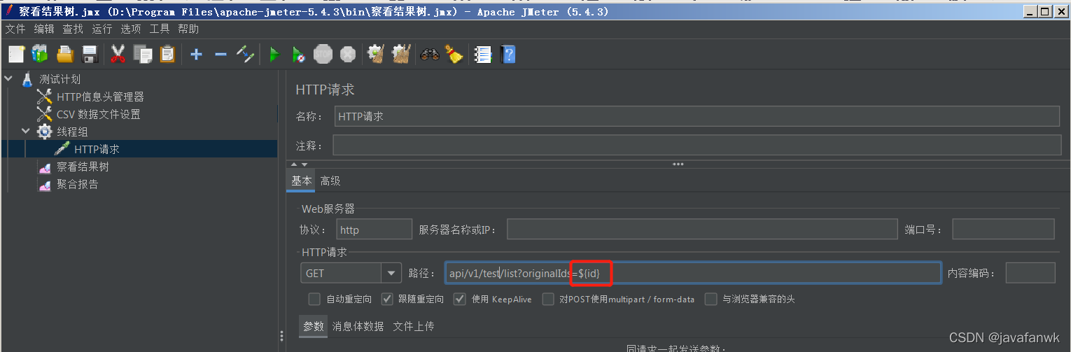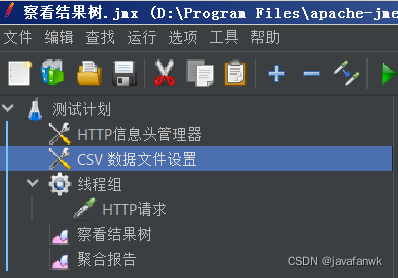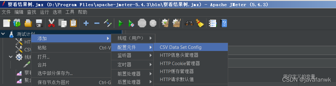 CSV数据文件配置用于从文件中读取行,可以是csv文件或者txt文件,并将它们拆分为变量。一、添加配置元件二、新增CSV文件二、添加聚合报告适合于批量的接口...
