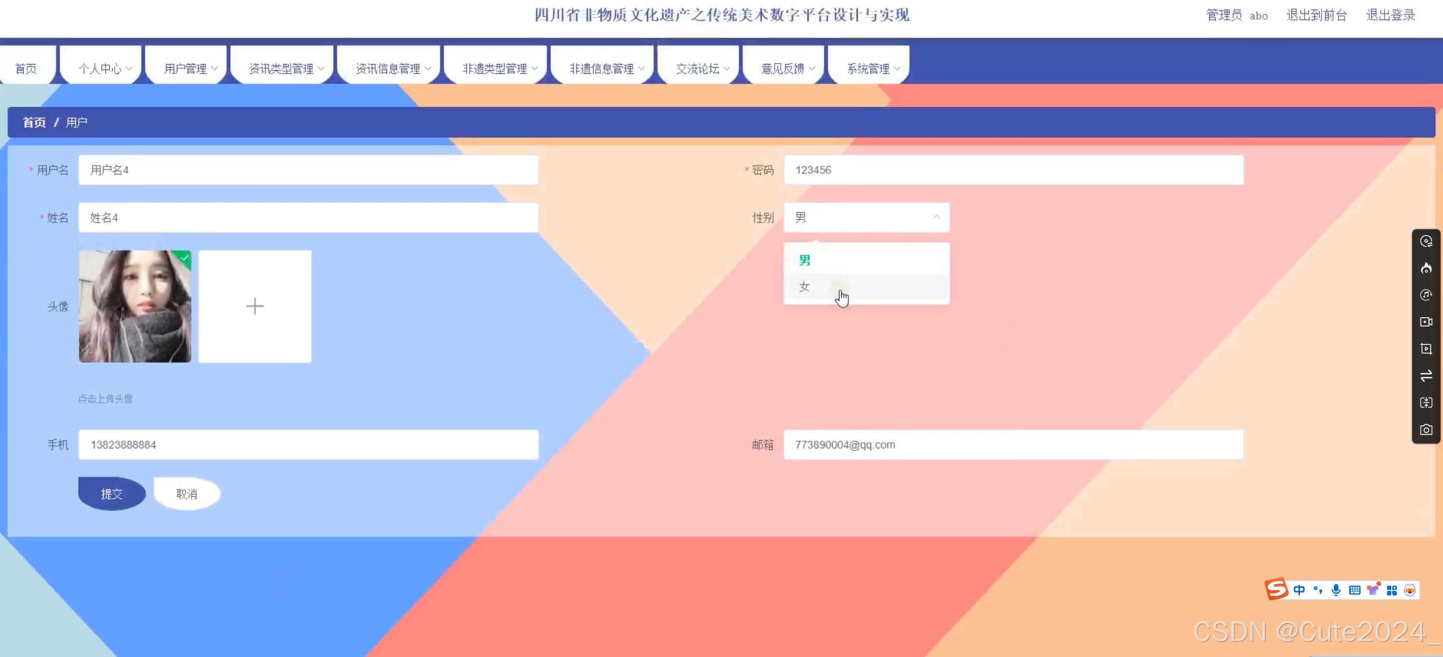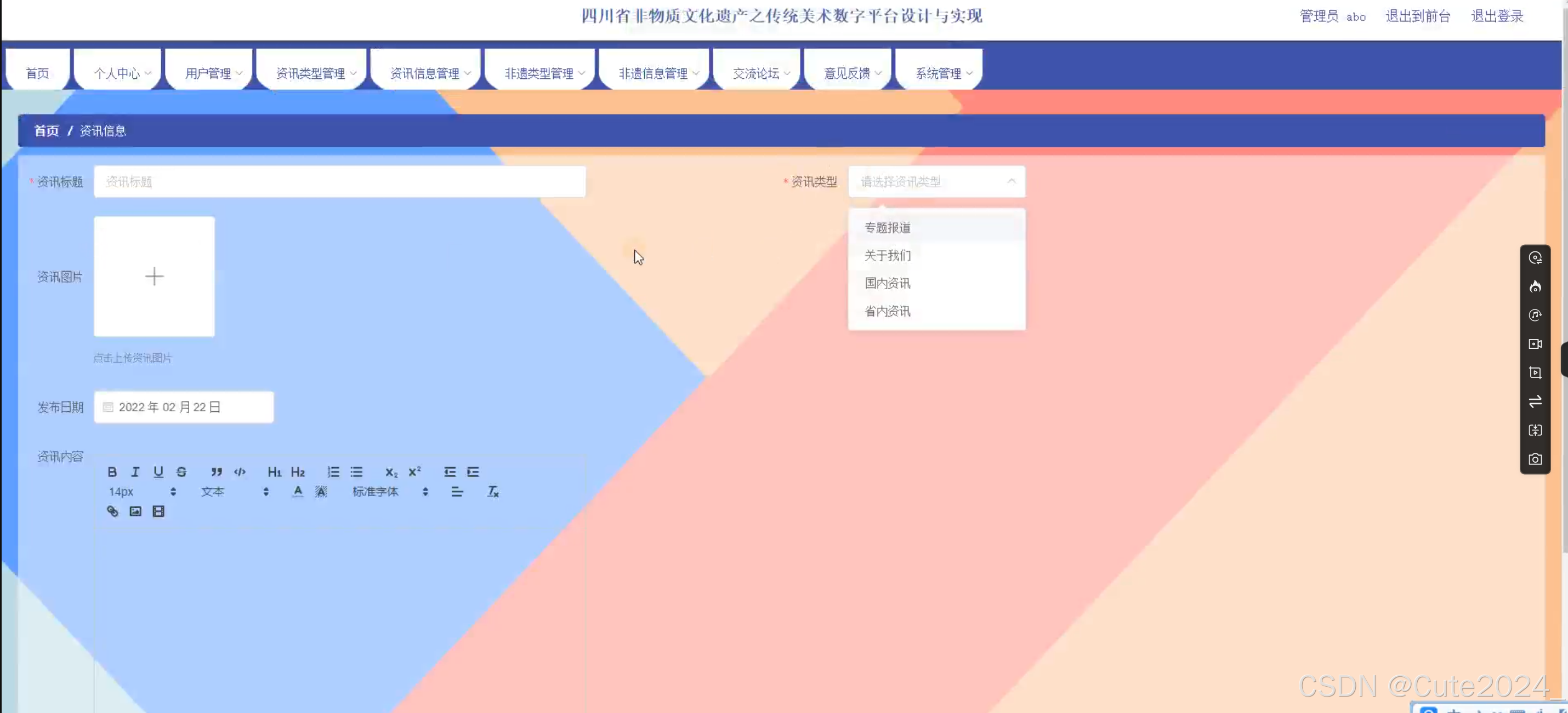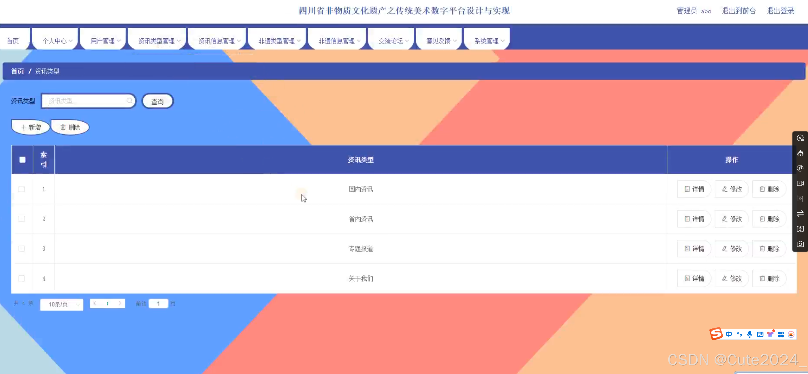 - 资讯类型与资讯信息管理:涵盖非遗新闻动态、活动预告、传承人访谈等内容,确保信息的时效性与丰富性。