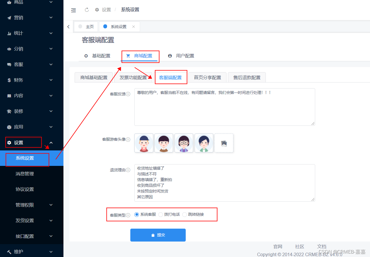 管理后台/设置/系统设置/商城配置/客服端配置有系统客服/拨打电话/跳转链接可选,系统客服为系统自带的客服系统,拨打电话为用户点击联系客服为拨打客服电话的方式,跳转链接为可以跳转自己开发的客服系统或者第三方的客服系统或者企业微信的客服系统CRMEB标准版采用全新客服系统,添加客服可通过后台创建客服账号,通过账号密码登录进客服系统即可使用,目前客服系统可以做到用户咨询自动分配,区分出用户是通过移动端