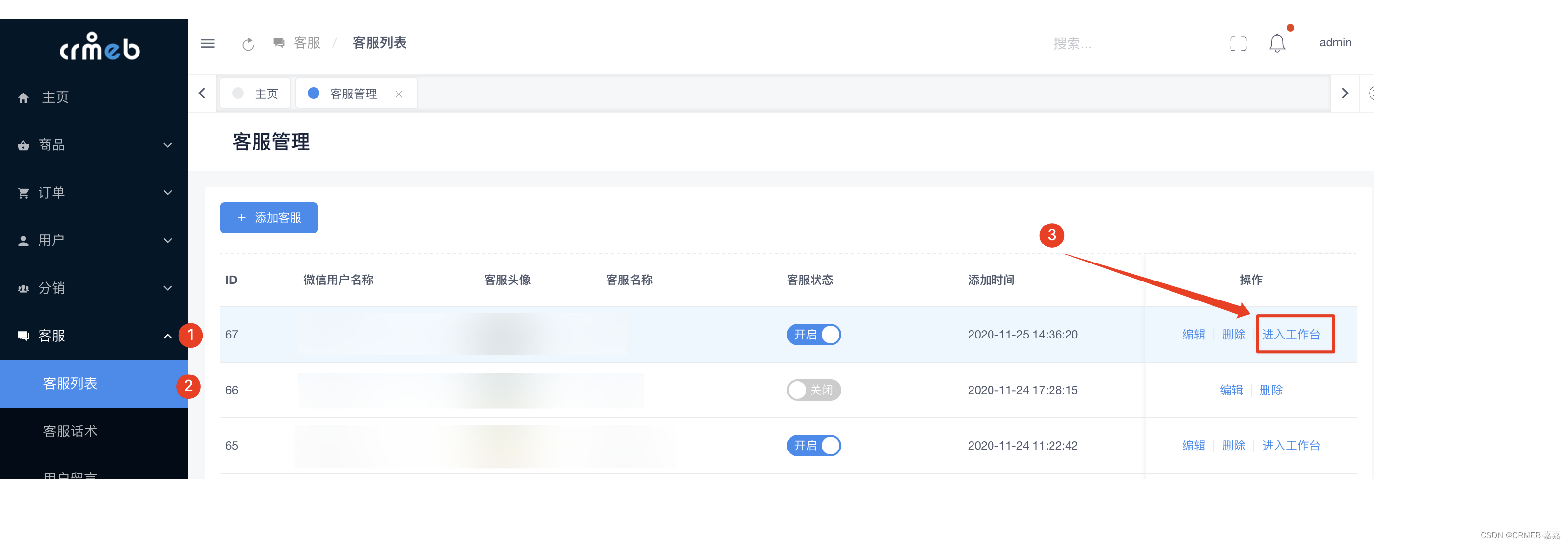 方式1:客服 > 客服列表 > 工作台