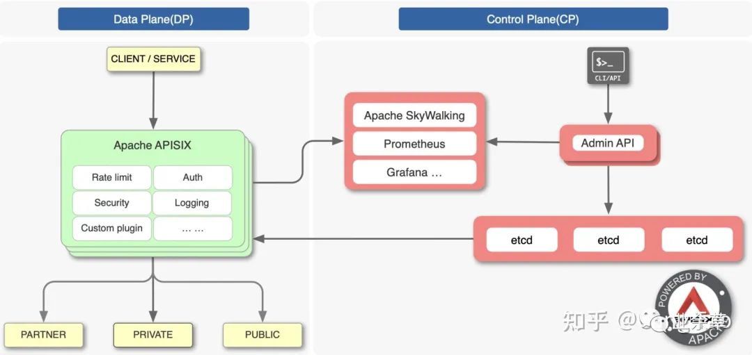 :APISIX 和 Kong 的架构类似,但是采用了云原生的设计,使用 ETCD 作为后台,性能上比起 Kong 有相当的优势,适合对性能要求高的云原生部署的场景。特别提一下,APISIX 支持 MQTT 协议,对于构建 IOT 应用非常友好。 -