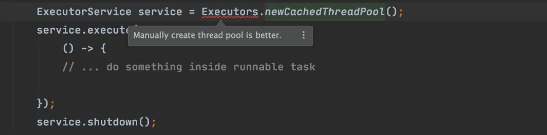 这个插件会实时检测出我们的代码不匹配它的规则的地方,并且会给出修改建议。比如我们按照下面的方式去创建线程池的话,这个插件就会帮我们检测出来,如下图所示。