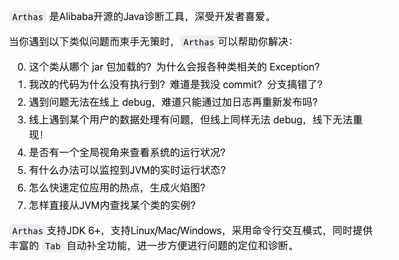 Arthas 把一些常用的 Java 诊断相关的功能封装起来了,提供简单的命令行操作,功能强大。