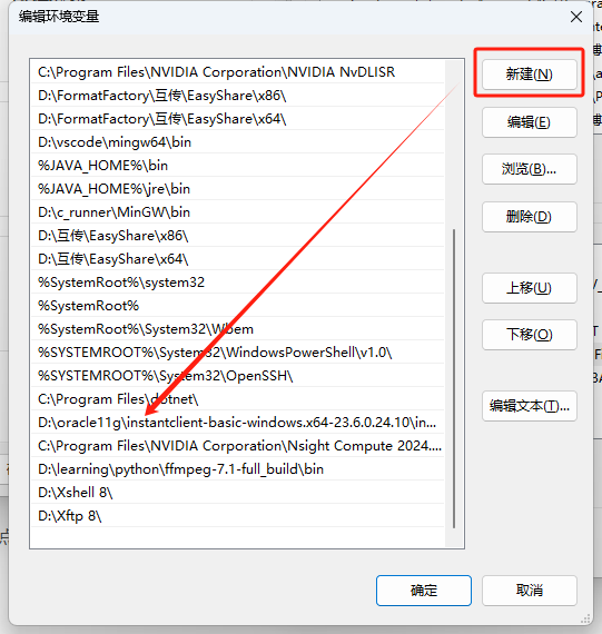 选择path后点击编辑,在新的弹窗点击新建,将刚刚的路径复制进去,但是要删除掉oci.dll部分,例如我的是: