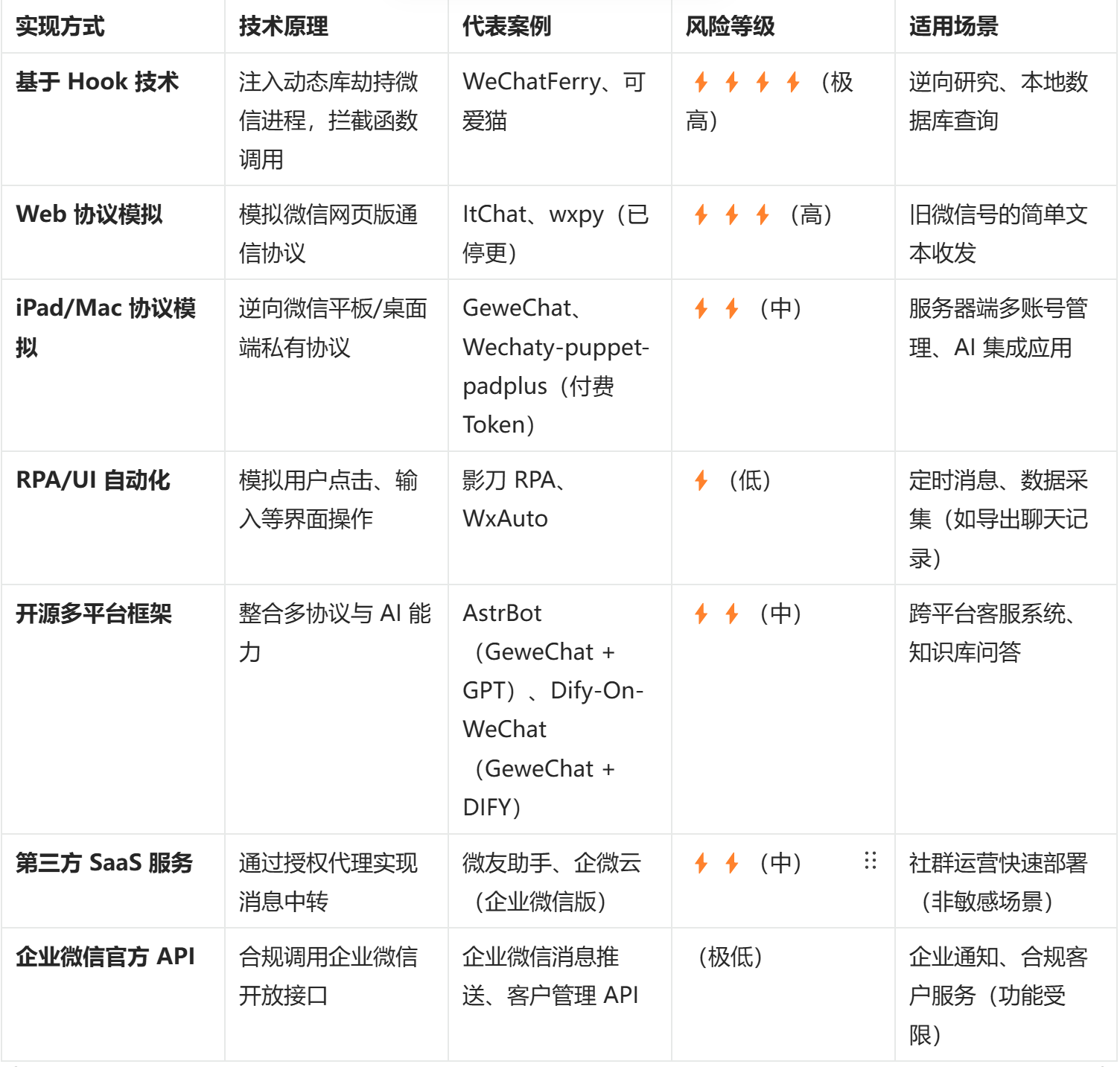 - 功能深度需求:可承受风险时选择 协议模拟(如 GeweChat)或 开源框架(AstrBot);