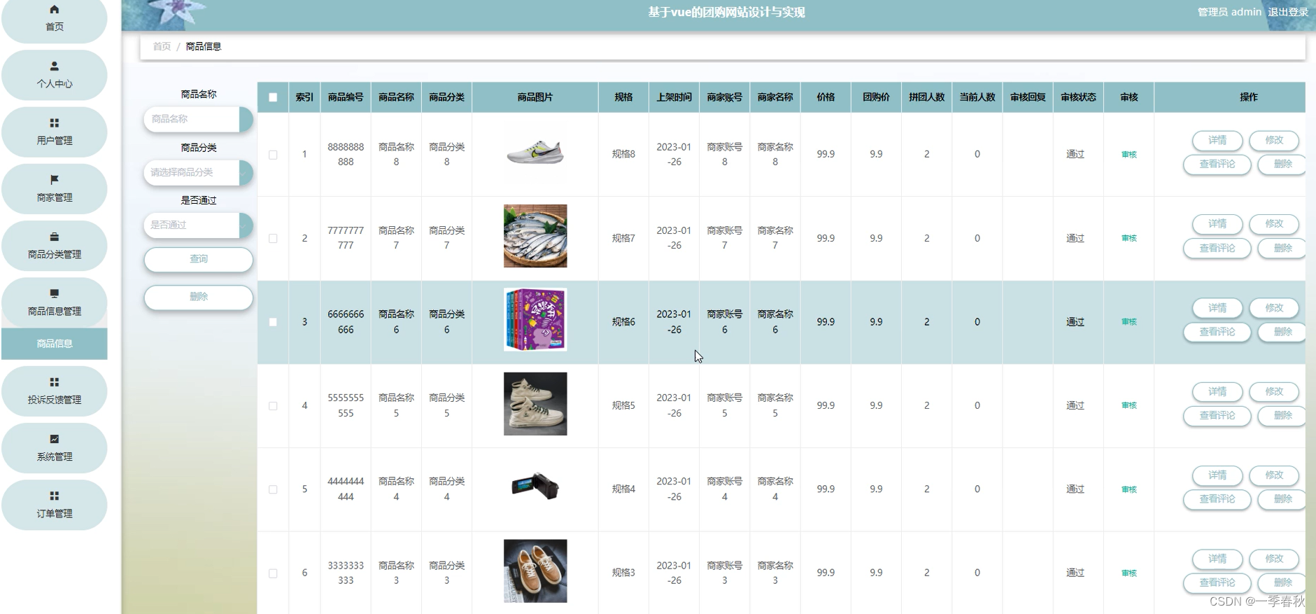 查询所有商品信息管理列表,查询商品信息,并对商品信息进行修改,可以对列表中商品信息进行删除。
