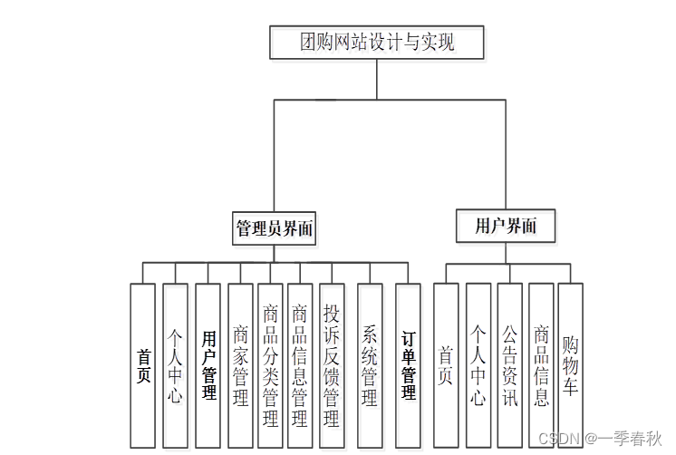 通过软件的需求分析已经获得了系统的基本功能需求,根据需求,将团购网站系统功能模块主要分为管理员模块。管理员添加商家管理、商品分类管理、商品信息管理、投诉反馈管理、订单管理等操作。如图是系统的功能结构图。