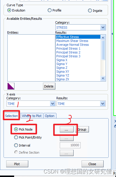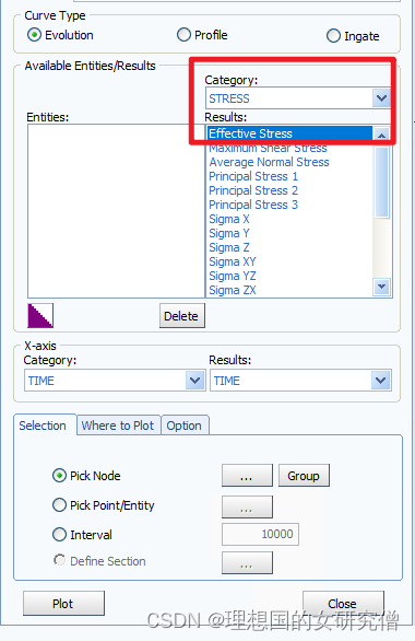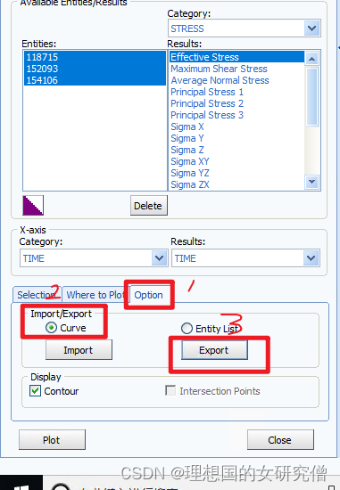 5.点击 plot 绘制曲线图,鼠标右击-tool-export curves,保存为.csv格式。6. 或者直接在绘制完曲线后,在option选项点集export curve,导出.xyn格式。2. 选择 Evolution/ Profile Curves。3. Category 选择 STRESS。4. 选择想要导出应力的点/点集。