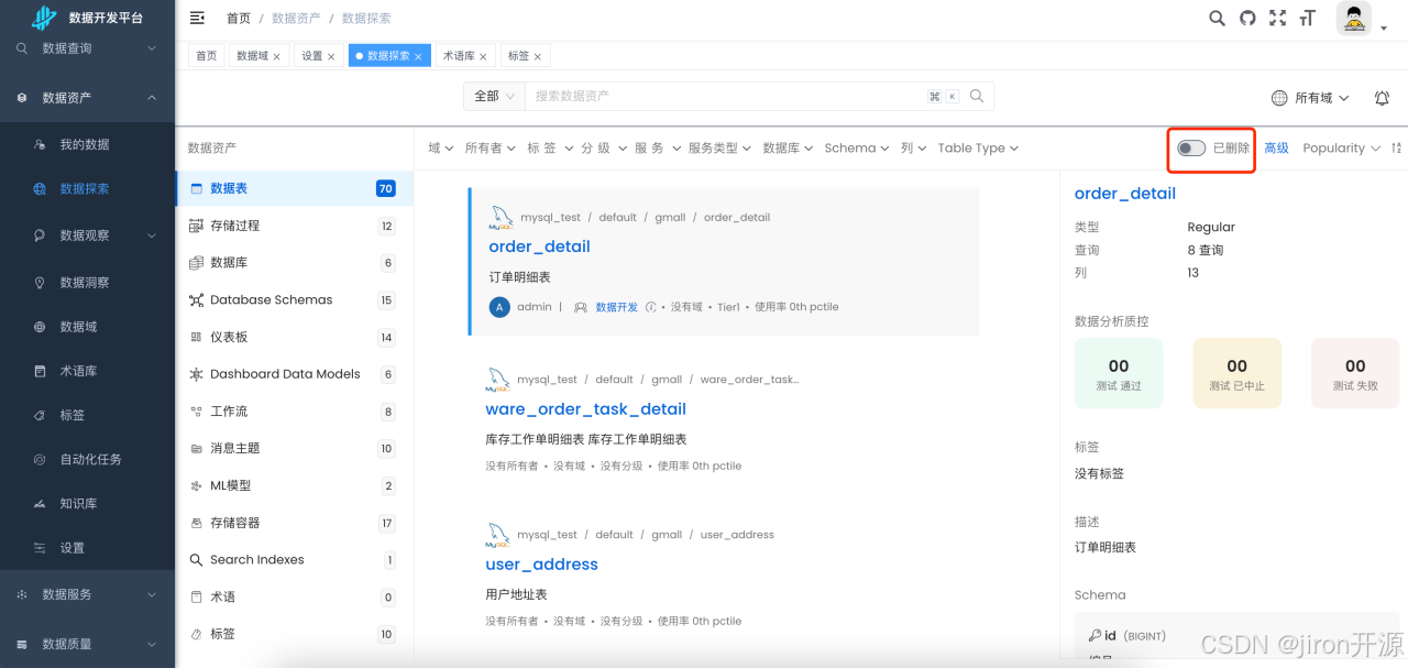 用户还可以搜索软删除的数据资产。使用切换栏搜索已删除的资产。删除的数据资产是只读的。