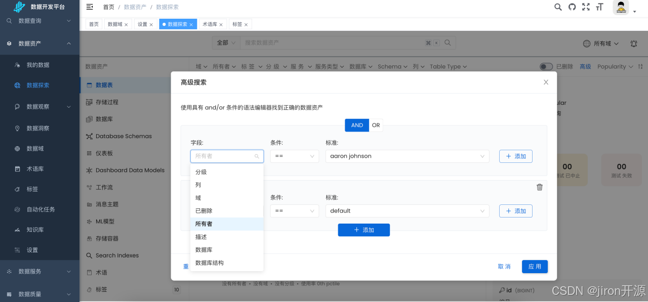 用户可以使用带和/或条件的语法编辑器,通过元数据属性上的多个参数找到符合严格标准的数据资产。高级搜索支持布尔运算符和分面查询来搜索数据的特定方面。单独的高级搜索选项可用于表、主题、仪表板、管道、ML模型、容器、术语表和标签。
