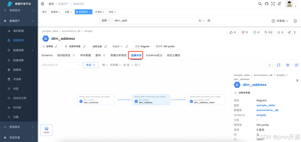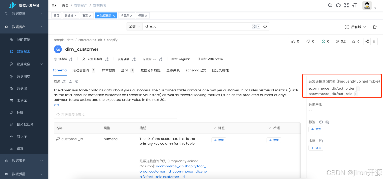 Jiron提供到由数据分析器测量的频繁连接的表和列的链接。您还可以通过基于数据血缘的关系来发现资产。