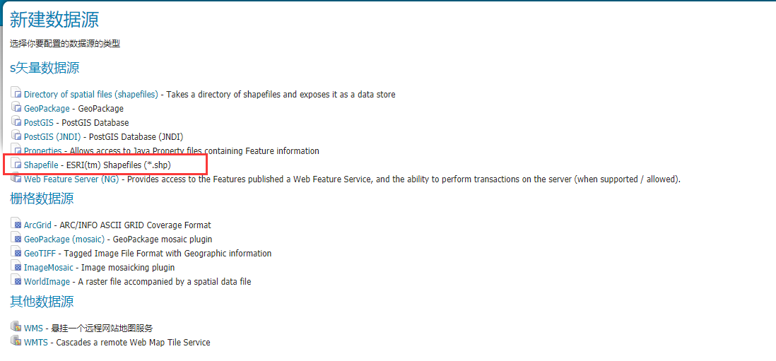 点击左侧“数据存储”,添加新的数据源,选择shpfile类型。指向你的shp文件。工作区选择刚刚自己新建的那个,数据源名称不是很重要。因为最终的数据源名称使用的是你的shp的文件名。