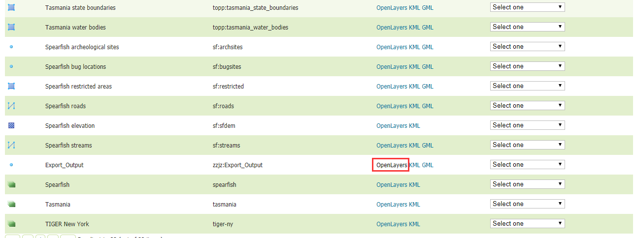 创建完毕后,点击左侧的"Layer Preview",在列表中可以看到自己创建的数据源。点击openlayers,可以预览。