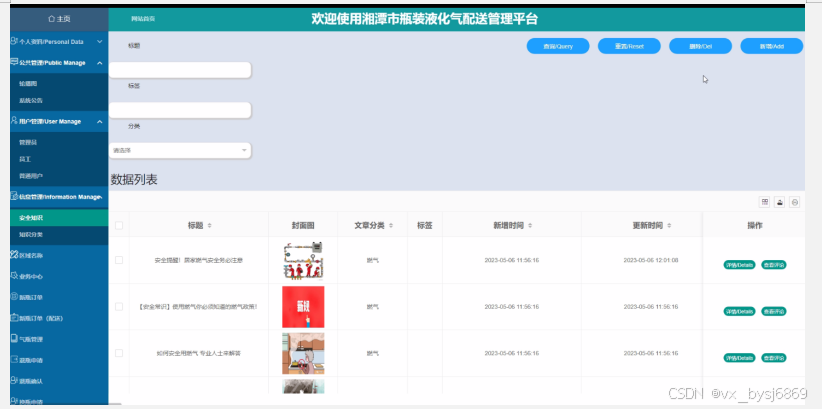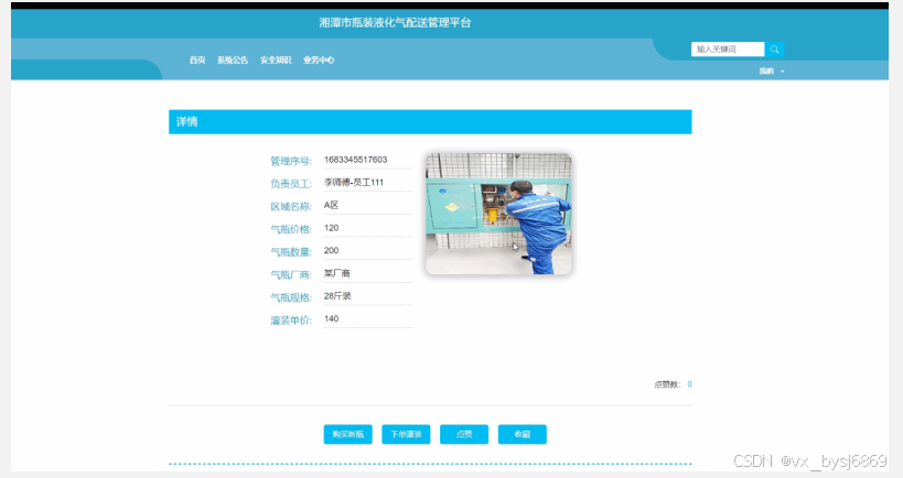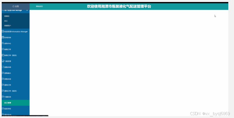 湘潭市瓶装液化气配送管理平台在系统的手机上可以运行,主要实现了管理员后端;首页、个人资料、公共管理(轮播图、系统公告)用户管理(管理员、员工、普通用户)信息管理(安全知识、知识分类)区域名称、业务中心、新瓶订单、新瓶订单(配送)气瓶管理、退瓶申请、退瓶确认、换瓶申请、灌装订单、灌装订单(配送)车辆信息、员工管理、配送评价等主要功能模块的操作和管理。