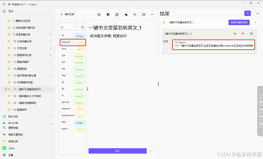 如果自己的数据原本就是中文变量名,想转换成英文,也可以选择第17条,一键中文变量名转换,比如将刚改成性别的变量转换成英文显示,但是这个功能目前只能转换成拼音。